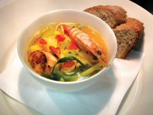 Our best ingredients are not necessarily to be found on the land so a light broth of fish stock and white wine with scallops and prawns is a perfect starter.