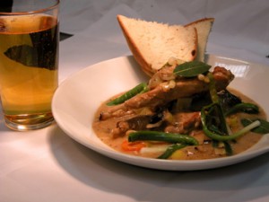 Rabbit cooked with mustard, fennel and cider with spring onions