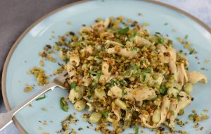 Crab and spring veg pasta with garlic and chilli breadcrumbs