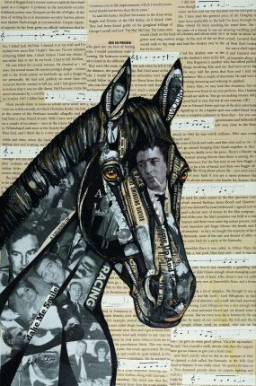 Blakey is often playful with her imagery. A labrador retriever is made up of Bombay Sapphire gin labels and the work called Gin Lab. Another collage of a fox-red labrador is called Best Bud and of course made of Budweiser beer labels. When it comes to her equestrian collages, Blakey’s punning expresses something rather more complex. She explains: “The horses’ names are important. When an owner chooses a horse’s name, they have to think of one that expresses something for themselves as well as for the public. It’s no coincidence that so many racegoers bet on a horse because of its name.”
