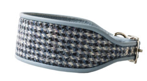 Cool blue Harris tweed collar made by Holly & Lil. Backed with soft calf leather suitable for the most sensitive of necks.