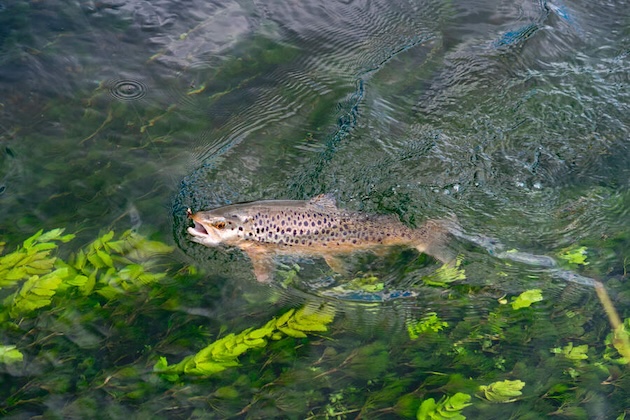 Quite often, the key to a successful early season is to ring the changes. Don’t tie on a dry fly at the start of the day and think that it will do. Be prepared to fish both nymphs and dries. When fishing nymphs, a simple rig with a heavy Goldhead on the point and a light Hare’s Ear or Pheasant Tail as a dropper will suffice. Run it through the slower pools and deeper runs; in the cooler waters trout will be holding closer to the bottom and minimising their energy expenditure. (Read The Field’s guide to the top 10 trout flies.)