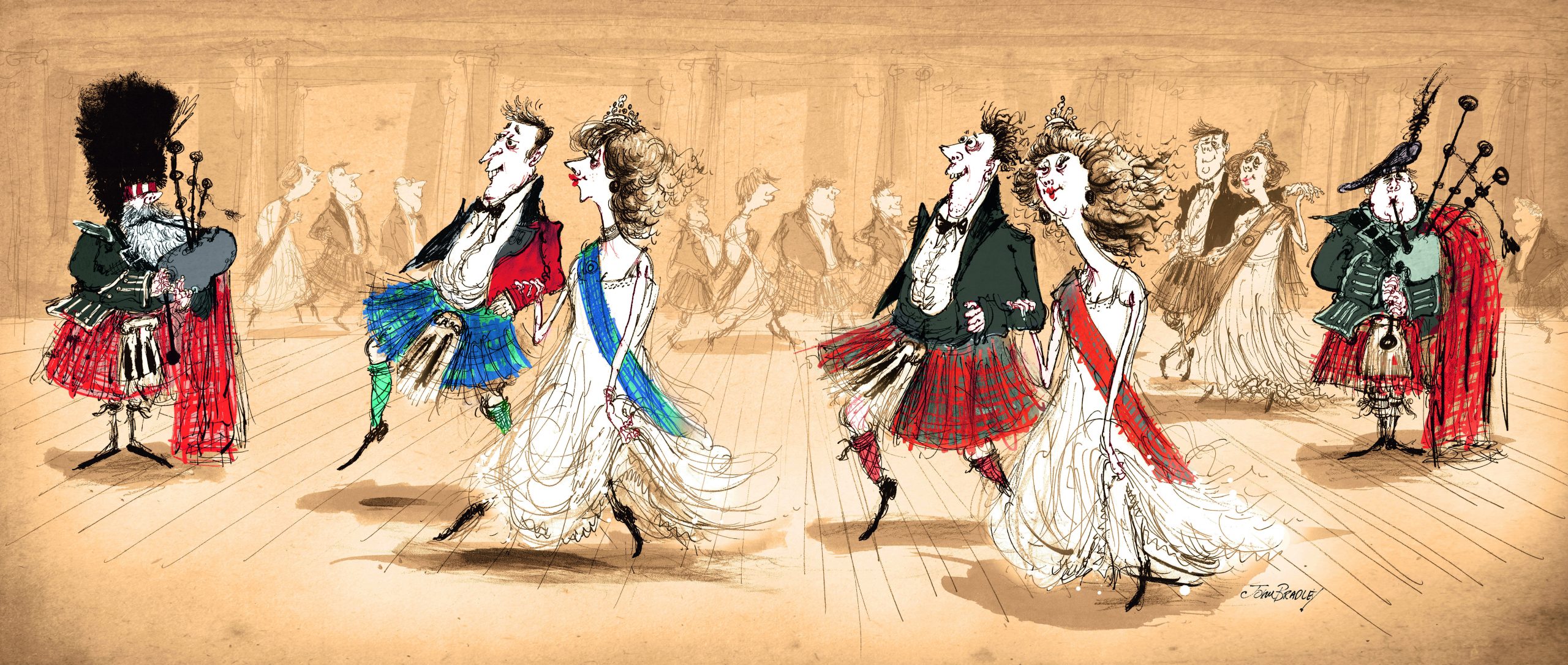 The same tradition continues at Scottish balls, where sash-wearing is an enduring part of the fun and revelries. Ladies’ dresses are often chosen to complement their tartan, with single-coloured frocks the order of the day to prevent a pattern clash.