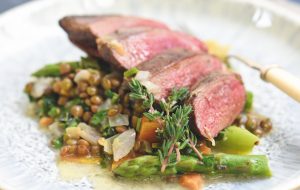 Pan-fried pigeon breast with lentils, asparagus and herbs