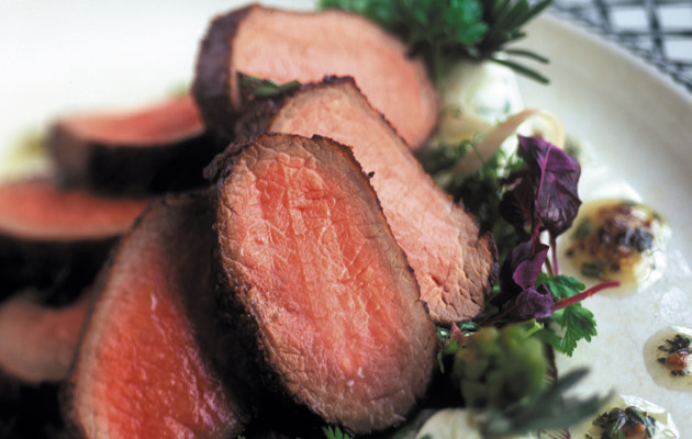 Unwrap the lamb. Heat a little olive oil in a frying pan and fry the meat for two to three minutes on each side until an even crust forms. Lift out of the pan and rest.