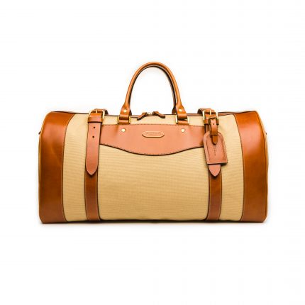 Canvas and vegetable-tanned leather with solid brass fittings, zipped internal pocket and quick-release shoulder strap. Named after the 19th-century Scottish-born hunter James Sutherland. Comes in a selection of hides or coloured canvas and leather.