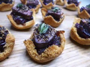 Christmas canapés: Pigeon, Madeira onions and black pudding crumbs in bread cases
